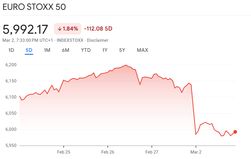 Nicht nur in Frankfurt, auch an den übrigen europäischen Börsen dominierten rote Vorzeichen. Der paneuropäische Leitindex EuroStoxx50 sank um 2,0 Prozent auf 6.018 Punkte. Investoren reduzierten Risikoengagements und setzten verstärkt auf defensive Positionierungen.
