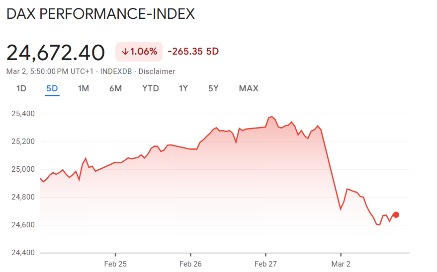 Mit dem Rückgang auf 24.688 Punkte entfernte sich der Dax spürbar von jüngsten Höchstständen. Die nahezu 600 Punkte Verlust markieren eine signifikante intraday-Bewegung und verstärken den Eindruck eines beschleunigten Abverkaufs.