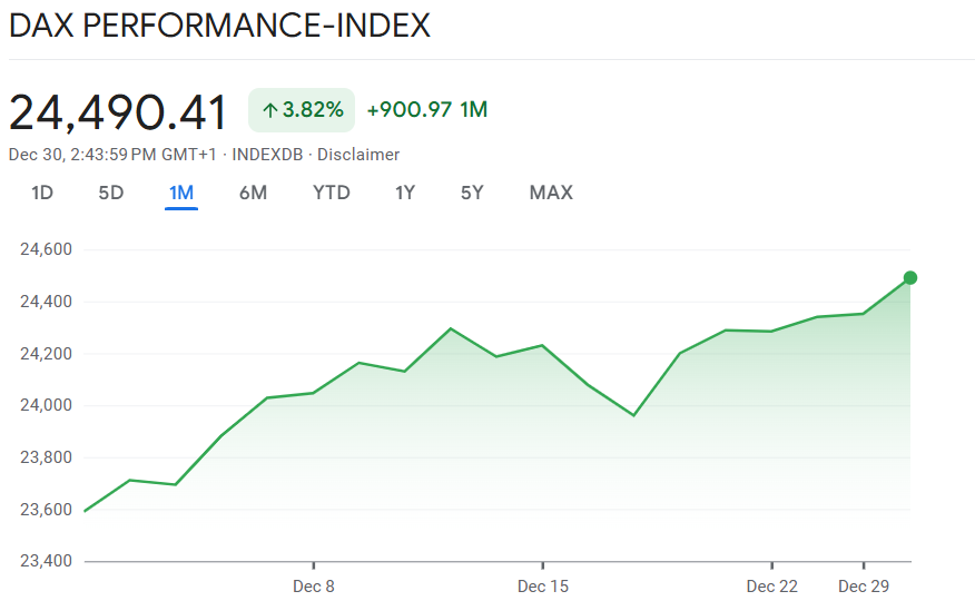 Zum Handelsschluss stand der Dax um 0,6 Prozent höher bei 24.490 Punkten. Damit setzte der Index einen positiven Schlusspunkt unter ein außergewöhnlich starkes Börsenjahr. Auf Jahressicht ergibt sich für 2025 ein Zuwachs von mehr als 22 Prozent, womit der deutsche Leitindex zu den stärkeren Märkten in Europa zählt.
