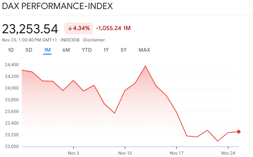 An den Aktienmärkten zeigte sich zu Wochenbeginn ein vorsichtiges Bild. Händler erwarten, dass die Euphorie der US-Börsen über mögliche Zinssenkungen im Dezember nicht vollständig auf Europa überspringt. Viele der Werte, die in den USA für Auftrieb sorgen – wie Google, Apple oder Tesla – sind in den europäischen Indizes kaum vertreten. Die Terminkontrakte auf den Dax lagen rund 50 Punkte unter dem Schlussstand des Vortages.