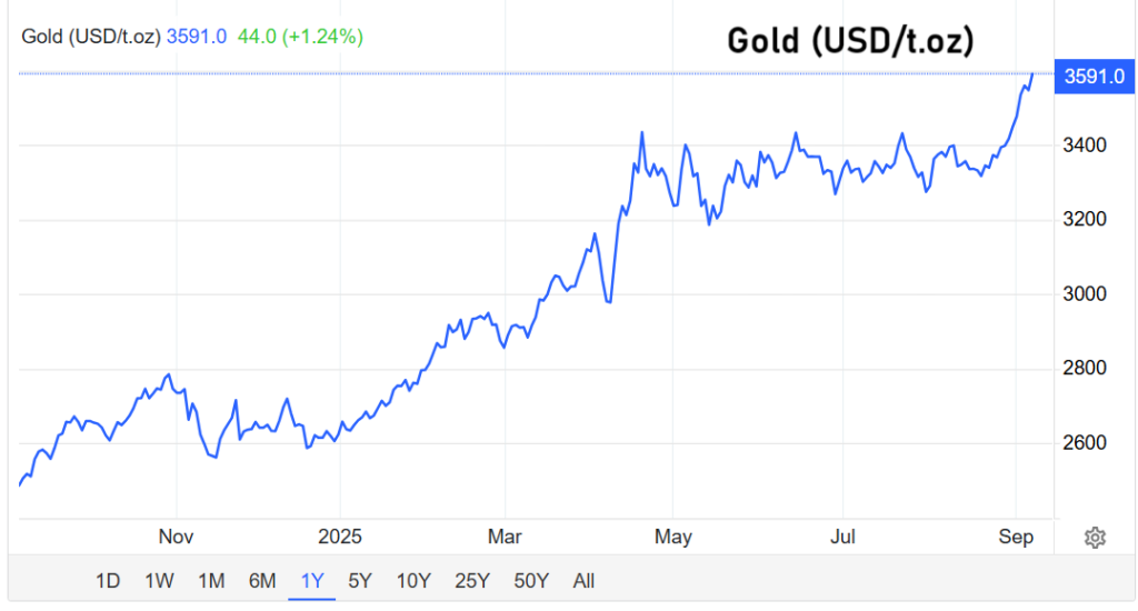 Die Entwicklung führte auch zu einem massiven Anstieg beim Goldpreis, der als klassischer sicherer Hafen gilt. Der Preis für eine Feinunze kletterte auf ein neues Rekordniveau von 3579 Dollar. Investoren greifen vermehrt zu Edelmetallen, da eine Zinssenkung in den USA wahrscheinlicher wird und somit inflationshemmende Anlageformen wie Gold an Attraktivität gewinnen.