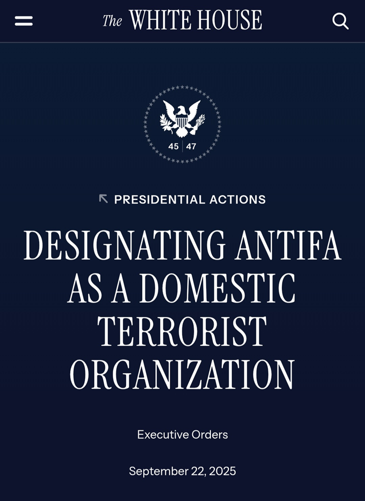 Das Weiße Haus erklärte, die Antifa sei eine „militaristische, anarchistische Gruppierung“, die den Sturz der Regierung, der Strafverfolgungsbehörden und des Rechtssystems mit gewaltsamen Mitteln anstrebe. Damit falle sie unter die Definition einer Terrorvereinigung. Trump stellte klar: „Es wird umfassende Ermittlungen gegen Antifa und deren Unterstützer geben.“
