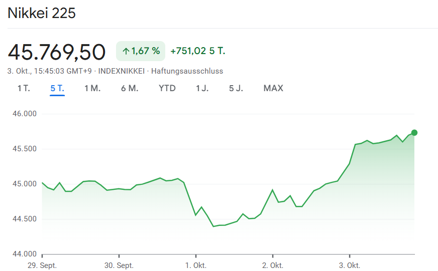 Zusätzliche Aufmerksamkeit gilt der bevorstehenden Wahl des neuen Premierministers durch die Regierungspartei LDP. Nach dem Rücktritt von Shigeru Ishiba im September wird am Wochenende ein Nachfolger bestimmt. Investoren erhoffen sich politische Stabilität und klare wirtschaftliche Leitlinien.