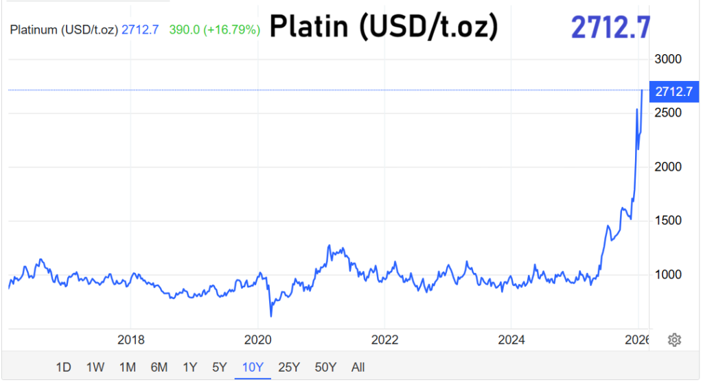 Als Treiber gelten anhaltende geopolitische Spannungen, darunter Konflikte im Nahen Osten, Unsicherheiten rund um den Iran sowie wiederkehrende Handelskonflikte zwischen den USA und Europa. Zwar hatte Donald Trump zuletzt einige Zolldrohungen im Zusammenhang mit Grönland zurückgenommen, doch sorgte diese Entspannung lediglich für eine kurze Pause. Bereits kurz darauf zogen die Preise für Edelmetalle erneut an.