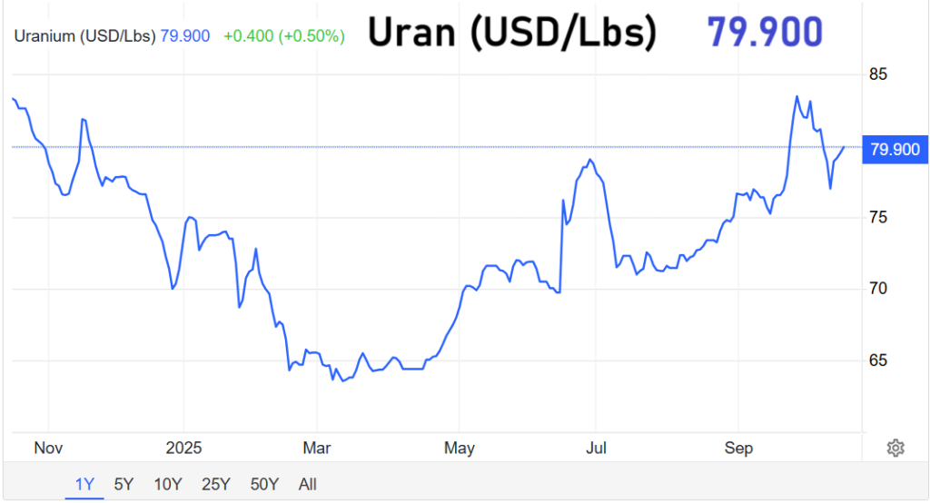 Diese tektonische Verschiebung im Energiesektor führt zu einem massiven Nachfrageanstieg nach Uran. Der Spotpreis erreichte Ende 2024 mit 110 US-Dollar je Pfund den höchsten Stand seit fast zwei Jahrzehnten und liegt derzeit bei 79 US-Dollar. Fachanalysten prognostizieren eine neue Hausse, da die weltweite Produktion schon heute jährlich um 40 Millionen Pfund unter dem tatsächlichen Bedarf liegt.
