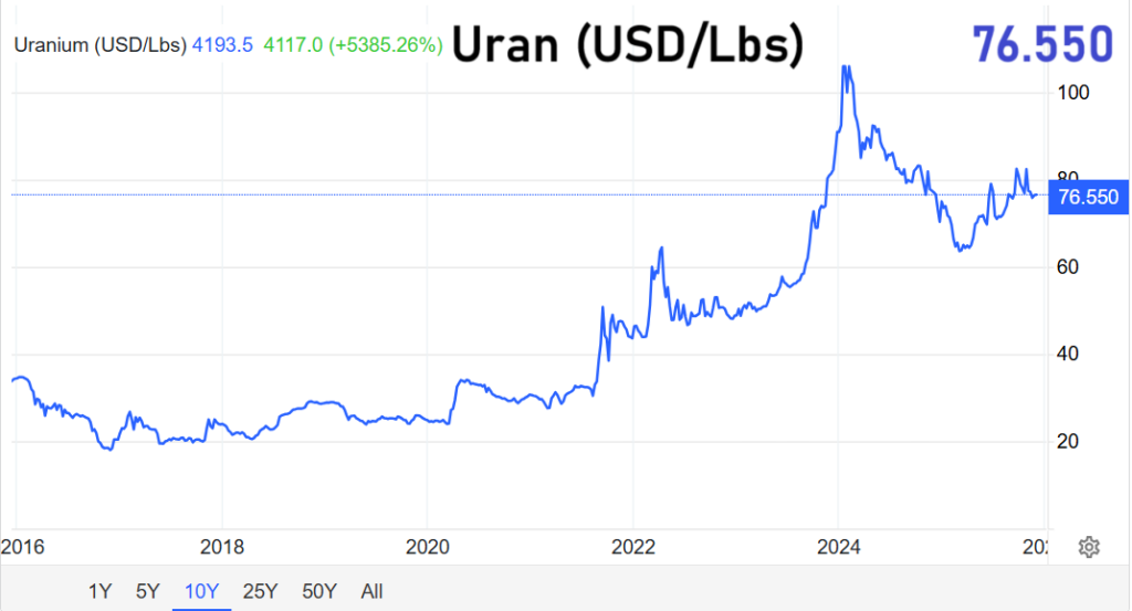 Der Spotpreis erreichte Ende 2024 ein Hoch von 110 US-Dollar je Pfund und liegt derzeit bei 76 US-Dollar – trotz eines jährlichen Angebotsdefizits von 40 Millionen Pfund. Das Uranium Red Book 2025 warnt bereits vor einer möglichen Verknappung der weltweiten Reserven, während gleichzeitig Hunderte neuer Reaktoren – vor allem in China, Indien und den USA – entstehen.