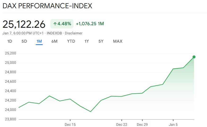 Der Jahresauftakt an den internationalen Aktienmärkten fällt außergewöhnlich stark aus. Sowohl der Dax als auch der Dow Jones haben neue Rekordmarken erreicht und damit ihre Bedeutung als globale Stimmungsbarometer eindrucksvoll unterstrichen. In Frankfurt überschritt der deutsche Leitindex erstmals die Schwelle von 25.000 Punkten und stieg im Tagesverlauf um 0,8 Prozent auf 25.101 Punkte. Auch in den USA setzte sich die Rekordjagd fort: Der Dow-Jones-Index markierte mit 49.621 Punkten ein neues Allzeithoch und notierte anschließend leicht darunter bei 49.497 Punkten.