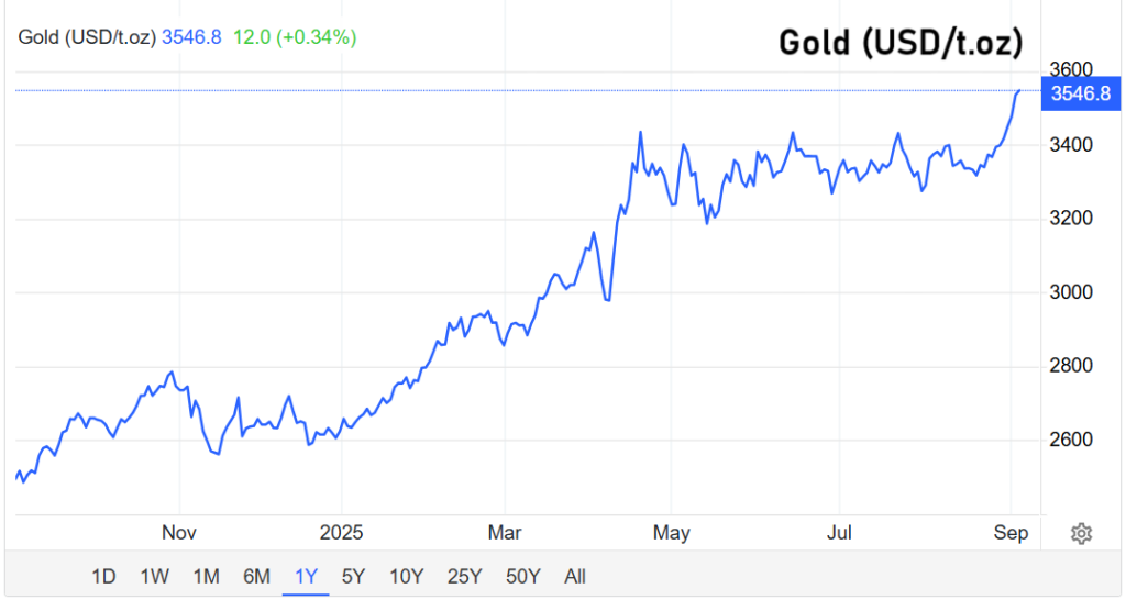 Die anhaltende Unsicherheit an den internationalen Finanzmärkten treibt immer mehr Investoren in klassische Schutzanlagen. Der Goldpreis stieg am Mittwoch auf ein neues Rekordniveau von 3.546,99 US-Dollar je Feinunze. Der Anstieg verdeutlicht die hohe Nachfrage nach Edelmetallen in Zeiten geopolitischer Spannungen und wirtschaftlicher Unsicherheit.