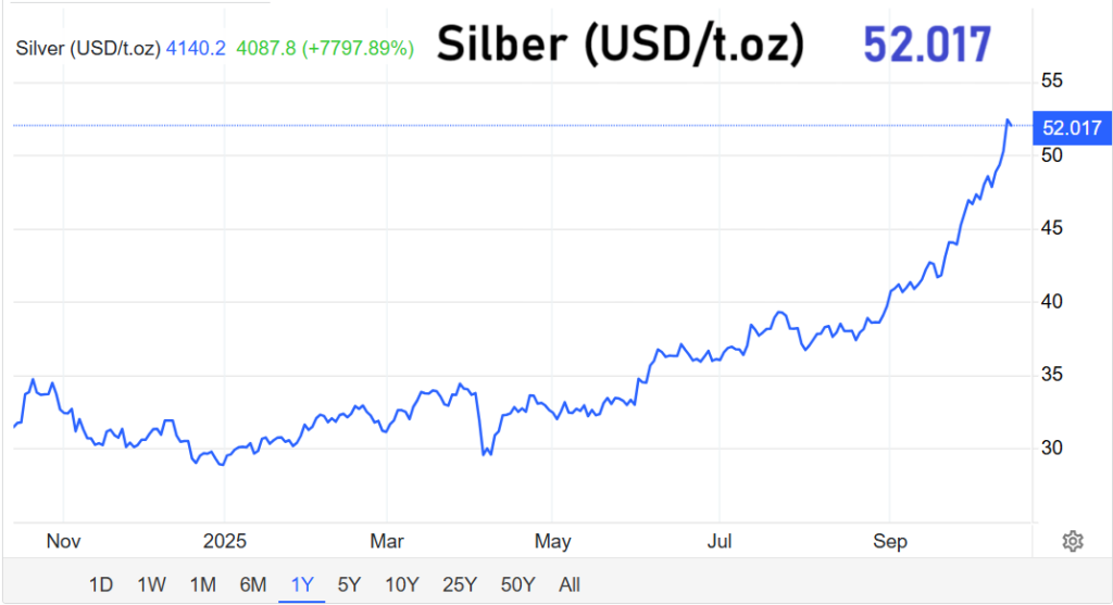 Der Spotpreis für eine Feinunze Silber stieg zuletzt auf 53,55 US-Dollar – ein Allzeithoch, das sogar den legendären Rekord von 1980 übertrifft. Während Gold seit Jahresbeginn rund 56 Prozent zulegte, explodierte der Silberpreis um fast 80 Prozent.